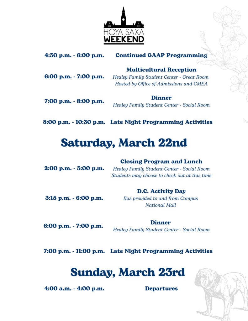 Hoya Saxa Weekend is run in conjunction with the Georgetown Admissions Ambassador Program (GAAP). Check out the Georgetown Admissions Ambassador Program (GAAP) website to learn more. Participants will be able to enjoy all the highlights of the GAAP program as well as immerse themselves in the Georgetown community, something that one can only get from living with current Hoyas and experiencing life on the Hilltop.