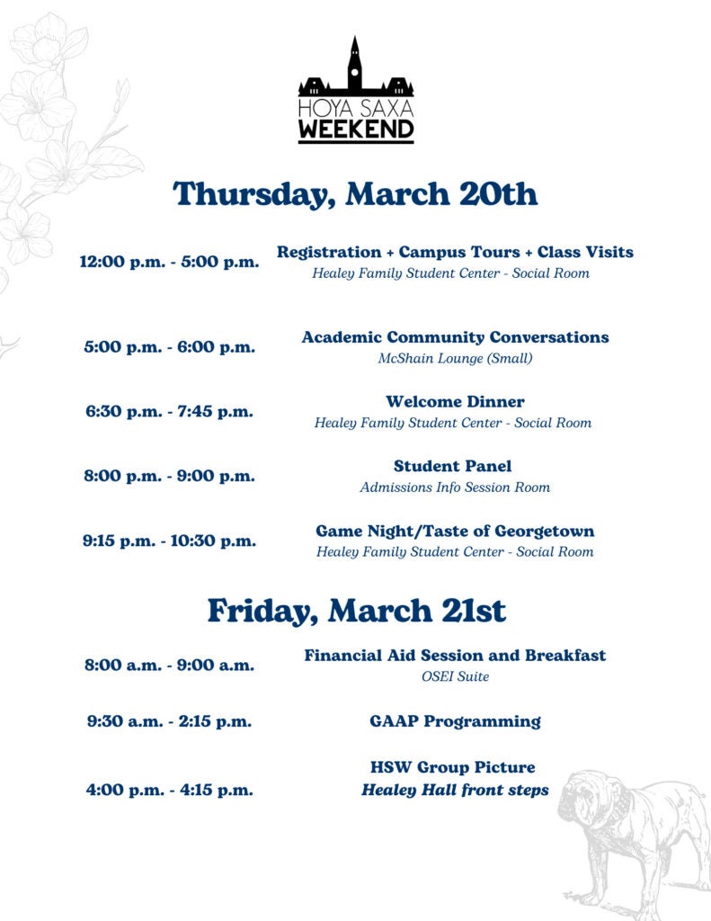Hoya Saxa Weekend is run in conjunction with the Georgetown Admissions Ambassador Program (GAAP). Check out the Georgetown Admissions Ambassador Program (GAAP) website to learn more. Participants will be able to enjoy all the highlights of the GAAP program as well as immerse themselves in the Georgetown community, something that one can only get from living with current Hoyas and experiencing life on the Hilltop.