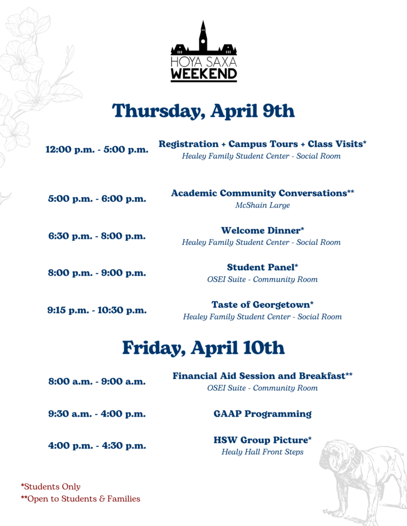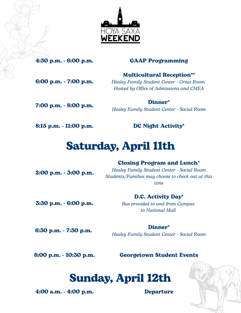 Please note dates and activities are subject to change – the schedule below is for reference for participants of our first Hoya Saxa Weekend for Regular Decision!