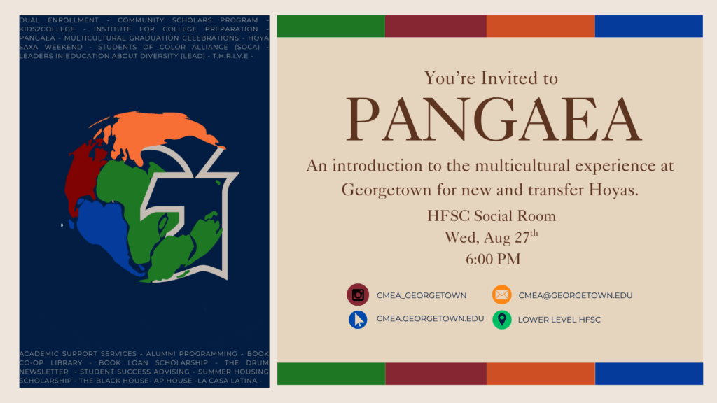 Pangaea is a welcome dinner for incoming first-year and transfer students and a brief introduction to the multicultural experience at Georgetown, which occurs on the first day of classes. It is also a chance for new students to interact with current students and staff.